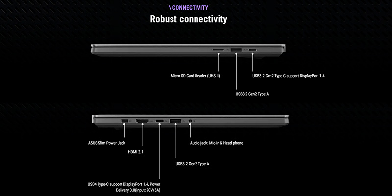 Laptop Gaming Asus ROG Zephyrus G14 GA403UV-QS091W được trang bị pin 76Wh, hỗ trợ sạc nhanh 100W qua USB-C, cung cấp thời lượng sử dụng dài, đảm bảo trải nghiệm liền mạch khi làm việc hoặc giải trí. Máy còn hỗ trợ đầy đủ các cổng kết nối hiện đại như HDMI 2.1, USB-C 3.2 Gen 2, USB-A, giắc cắm tai nghe 3.5mm, đáp ứng mọi nhu cầu kết nối của người dùng.