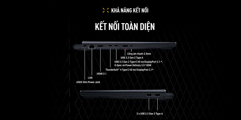 Laptop Gaming ASUS TUF Gaming F16 FX608JMR-RV048W được trang bị đầy đủ kết nối hiện đại như Thunderbolt 4, USB-C Gen2, HDMI 2.1, RJ45 LAN, 3x USB-A Gen2 và cổng âm thanh 3.5mm, cho phép kết nối đa thiết bị ngoại vi với tốc độ truyền tải cực nhanh. Đặc biệt, máy hỗ trợ Wi-Fi 6E và Bluetooth 5.3, cho kết nối mạng ổn định, tốc độ cao, lý tưởng cho game online và livestream. Pin dung lượng 90Wh, kết hợp sạc nhanh qua USB-C Power Delivery (tối đa 100W) giúp bạn sử dụng linh hoạt cả ngày mà không lo gián đoạn. Hệ thống âm thanh 2 loa hỗ trợ Dolby Atmos và Hi-Res Audio, kết hợp AI Noise-Canceling Mic giúp cải thiện chất lượng âm thanh khi họp online, stream hoặc gọi video. Webcam 1080p IR hỗ trợ Windows Hello giúp đăng nhập bằng nhận diện khuôn mặt an toàn, tiện lợi. Tổng thể, đây là một hệ thống giải trí và làm việc toàn diện, xứng đáng trong tầm giá.