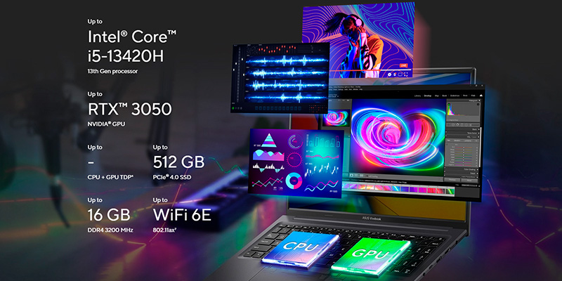 Laptop Gaming ASUS Vivobook 16X K3605VC-RP431W (i5-13420H, RTX 3050 4GB, RAM 16GB DDR4, SSD 512GB, 16 Inch IPS WUXGA 144Hz, Win 11) với Intel Core i5-13420H (8 nhân, 12 luồng, xung nhịp lên đến 4.6GHz), kết hợp với card đồ họa rời NVIDIA GeForce RTX 3050 4GB GDDR6, sản phẩm này có thể xử lý trơn tru cả các tựa game phổ biến như Valorant, Apex Legends, Liên Minh Huyền Thoại, cũng như các phần mềm sáng tạo như Photoshop, Premiere, AutoCAD.