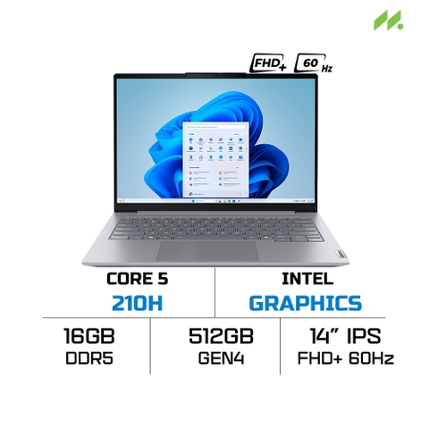 Laptop Lenovo ThinkBook 14 G8 IRL 21SG007SVN (Core 5 210H, Intel Graphics, RAM 16GB DDR5, SSD 512GB, 14 inch WUXGA 60Hz, Window 11) được thiết kế theo phong cách thiết kế hiện đại, thanh lịch với tông màu Xám (Arctic Grey) bắt mắt. Sự kết hợp thông minh giữa nắp máy bằng hợp kim Nhôm (Aluminium) sang trọng và mặt đáy bằng chất liệu PC-ABS giúp thiết bị duy trì được độ bền bỉ đáng tin cậy nhưng vẫn tối ưu trọng lượng ở mức vô cùng nhẹ nhàng, chỉ 1.36 kg cùng độ mỏng 17.5 mm mang lại tính linh hoạt rất cao. Về trải nghiệm thị giác, máy được trang bị màn hình 14.0 inch tỷ lệ 16:10 với độ phân giải WUXGA (1920 x 1200) sắc nét. Tấm nền IPS, tần số quét 60Hz cùng độ sáng 300 nits mang lại không gian làm việc rộng rãi, hiển thị văn bản rõ ràng và chống chói hiệu quả khi làm việc dưới ánh sáng mạnh.