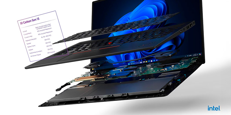 Giữ vững vị thế là dòng laptop doanh nhân di động hàng đầu, X1 Carbon Gen 13 tiếp tục sử dụng chất liệu cao cấp với nắp máy bằng sợi Carbon (Carbon Fiber) và mặt đáy bằng nhôm (Aluminium). Sự kết hợp này không chỉ mang lại độ bền đạt chuẩn quân đội mà còn giúp tối ưu trọng lượng đến mức khó tin, chỉ khởi điểm từ 1006g (khoảng 1kg). Với độ mỏng ấn tượng và lớp sơn đen "Black Paint" sang trọng, đây là người bạn đồng hành đẳng cấp và linh hoạt tuyệt đối cho các doanh nhân thường xuyên di chuyển.