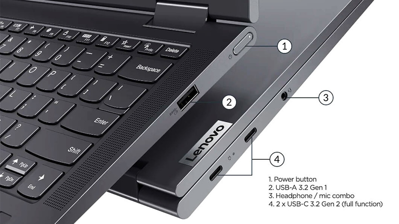 Kết nối đa dạng Laptop Lenovo Yoga 7 14ACN6 82N7008VVN trang bị các kết nối hiện đại như cổng USB 3.2, ThunderBolt và HDMI giúp việc sao lưu dữ liệu cùng kết nối với các thiết bị ngoại vi trở nên dễ dàng hơn. |
