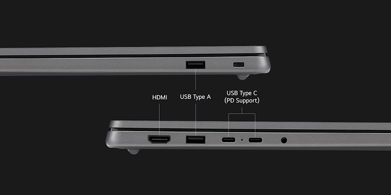 LG gram Book 15U50T-G.AV56A5 được trang bị đầy đủ các cổng kết nối cần thiết cho công việc: cổng HDMI hỗ trợ xuất hình ảnh chất lượng 4K@60Hz, 2 cổng USB-C 3.2 Gen 2 hỗ trợ sạc (PD Support) và truyền dữ liệu nhanh, cùng cổng USB-A truyền thống. Kết nối không dây được đảm bảo bởi Wi-Fi 6 và Bluetooth 5.2, mang lại đường truyền ổn định và tốc độ cao.