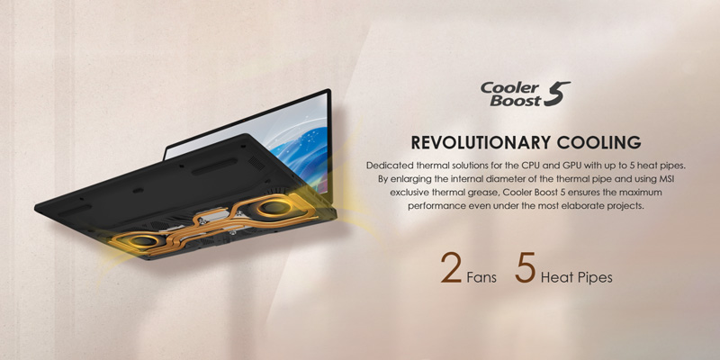 Laptop MSI Creator M16 HX C14VFG-040VN được trang bị hệ thống tản nhiệt Cooler Boost 5 với 2 quạt tản nhiệt và 5 ống dẫn nhiệt. Hệ thống này giúp máy luôn hoạt động mát mẻ và ổn định ngay cả khi sử dụng với cường độ cao.