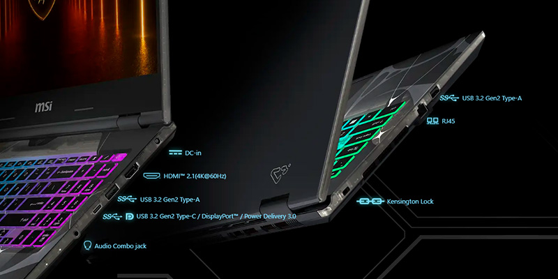 MSI Cyborg 15 B13WEKG-676VN được trang bị bàn phím RGB 4 vùng tích hợp phím Copilot giúp tùy chỉnh ánh sáng linh hoạt và dễ dàng thao tác trong bóng tối. Laptop hỗ trợ HDMI 2.1 (4K@60Hz), Wi-Fi 6E, Bluetooth 5.3, cổng LAN Gigabit Ethernet và USB-A/USB-C tốc độ cao, đảm bảo kết nối ổn định trong mọi hoàn cảnh. Viên pin 55.2Wh kết hợp bộ sạc 120W giúp thời lượng sử dụng kéo dài và sạc nhanh chóng. Ngoài ra, webcam HD 720p hỗ trợ 3D Noise Reduction (3DNR) giúp hình ảnh rõ nét hơn trong các cuộc gọi video hoặc buổi học online.