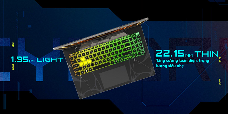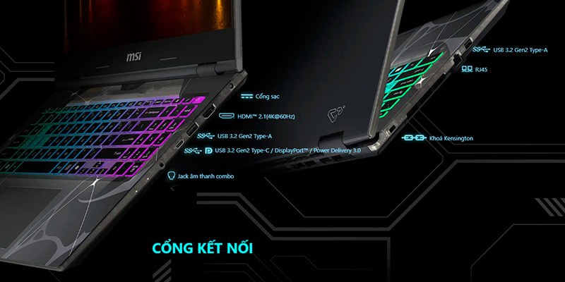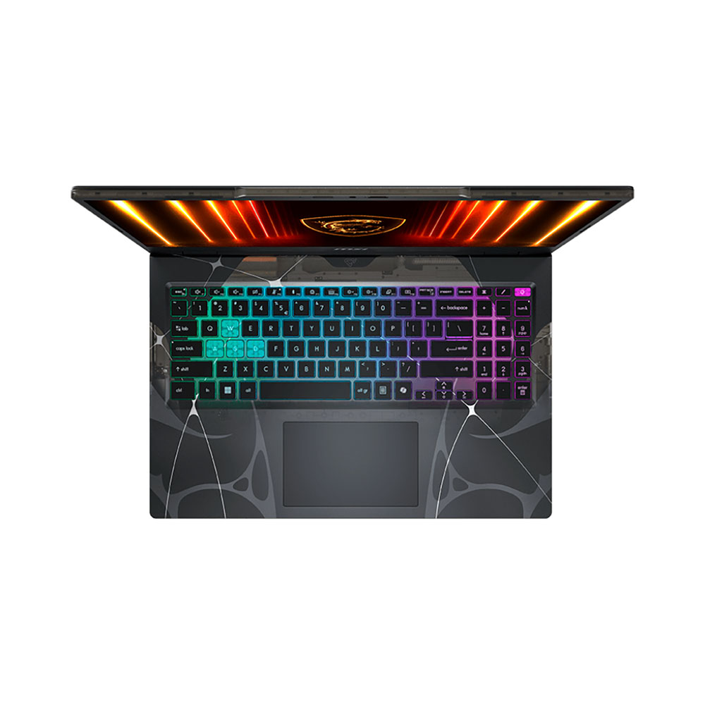 Laptop MSI Cyborg 15 mang đến một diện mạo độc đáo với lớp vỏ màu đen mờ, đường nét sắc sảo và chi tiết thiết kế lấy cảm hứng từ phong cách cyborg. Máy có kích thước 359.3 x 245.25 x 22.15-23.15 mm và trọng lượng chỉ 1.95kg, dễ dàng mang theo trong balo nhưng vẫn giữ được sự chắc chắn. Bàn phím RGB 4 vùng tích hợp phím Copilot AI tạo điểm nhấn hiện đại, vừa nâng cao trải nghiệm gõ phím, vừa tăng thêm tính tiện lợi trong các tác vụ hàng ngày.
