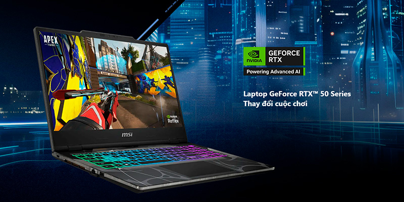 Điểm nổi bật của Laptop MSI Cyborg 15 chính là GPU NVIDIA GeForce RTX 5060 8GB GDDR7. Với 572 AI TOPS, card đồ họa này không chỉ mang lại khả năng chơi game ấn tượng với công nghệ Ray Tracing và DLSS, mà còn tăng tốc xử lý các ứng dụng liên quan đến AI, sáng tạo nội dung và đồ họa. TGP tối đa 55W với Dynamic Boost giúp duy trì hiệu năng ổn định, tối ưu trải nghiệm trong nhiều tình huống sử dụng khác nhau.