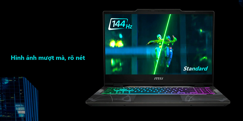 MSI Cyborg 15 được trang bị màn hình 15.6 inch FHD (1920x1080) IPS-level với tần số quét 144Hz, hiển thị khung hình mượt mà, giảm thiểu tình trạng xé hình và bóng mờ. Với độ sáng đạt 300 nits, màn hình mang đến trải nghiệm rõ ràng, màu sắc trung thực trong nhiều môi trường sử dụng khác nhau. Đây là lựa chọn lý tưởng cho những game thủ cần màn hình tốc độ cao và độ sắc nét tối ưu.