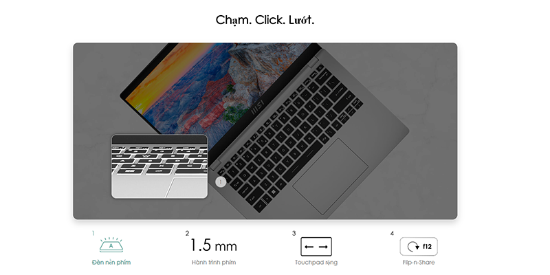 Bàn phím đèn nền trắng, touchpad đa điểm hiện đại