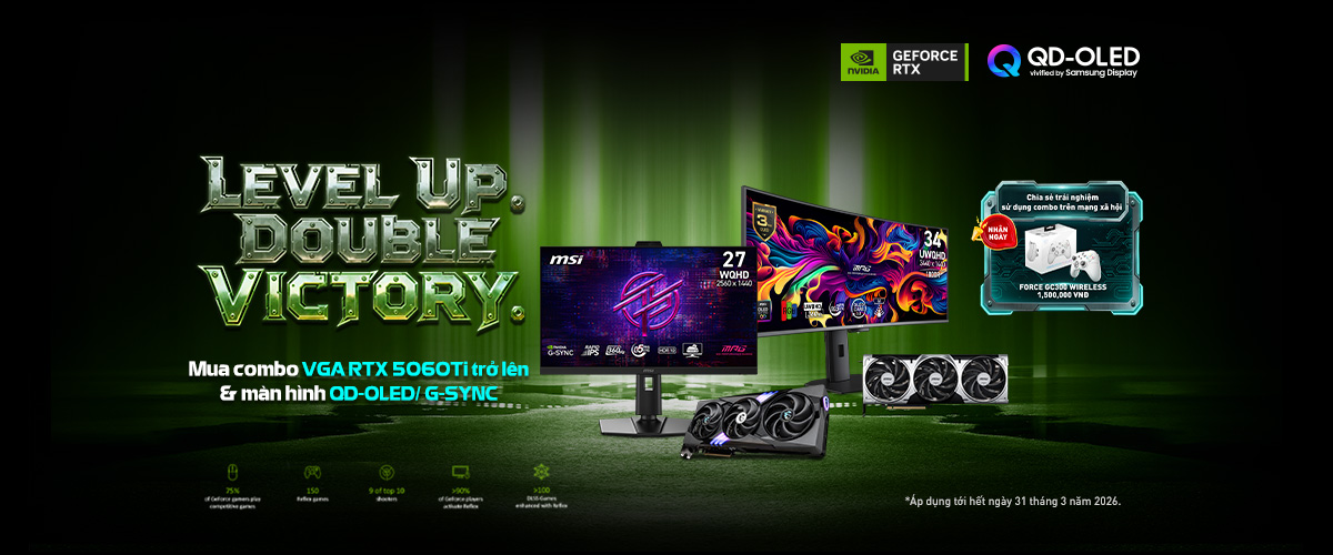 Chương trình áp dụng khi mua combo card đồ họa MSI GeForce RTX 5060 Ti trở lên cùng màn hình QD-OLED hoặc G-SYNC, combo mạnh mẽ xử lý tốt các tựa game AAA, phần mềm đồ họa và ứng dụng AI hiện đại mang đến trải nghiệm hình ảnh mượt mà, màu sắc sống động và độ trễ cực thấp.