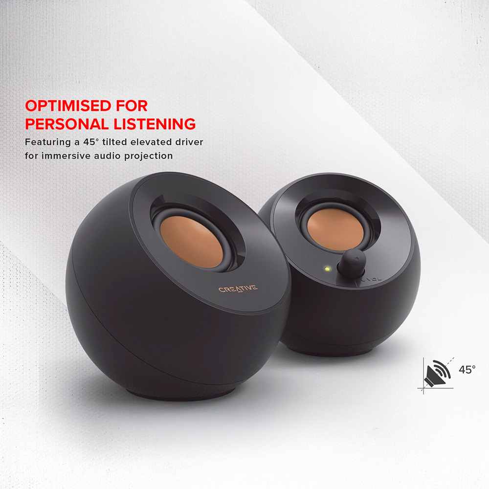Creative Pebble Black gây ấn tượng với thiết kế hình cầu độc đáo, lấy cảm hứng từ những viên đá cuội tự nhiên, mang lại cảm giác mềm mại, hiện đại và tinh tế. Hai loa kích thước chỉ 122 x 116 x 115mm mỗi bên, trọng lượng nhẹ (tổng khoảng 650g) giúp dễ dàng bố trí ngay cả trên bàn làm việc nhỏ hoặc không gian học tập cá nhân. Bề mặt đen mờ chống bám vân tay, cùng góc nghiêng 45 độ hướng âm thanh trực tiếp tới người nghe, tối ưu trải nghiệm âm thanh dù ngồi gần hay xa màn hình.