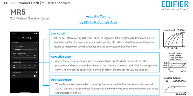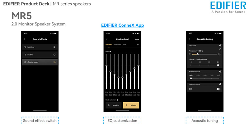 Loa Edifier MR5 được trang bị đầy đủ các nút điều chỉnh âm lượng, EQ bass – treble, Bluetooth mode và còn hỗ trợ điều khiển thông qua ứng dụng Edifier ConneX. Bên cạnh đó là các chế độ tinh chỉnh âm học như Acoustic Space, Desktop Control, High/Low Cut, giúp tối ưu âm thanh phù hợp với từng vị trí và không gian cụ thể. Đây là công cụ lý tưởng cho người dùng chuyên nghiệp muốn kiểm soát và cá nhân hóa chất âm theo nhu cầu.