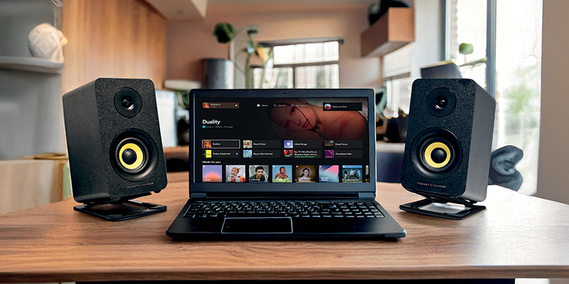 Kumpel gây ấn tượng với kiểu dáng loa gỗ HDAA cao cấp phủ màu đen hiện đại, mang lại độ bền vượt trội và giảm rung khi hoạt động ở âm lượng lớn. Kích thước mỗi loa chỉ 120 x 130 x 230 mm, gọn gàng nhưng vẫn nổi bật trên bàn làm việc hay góc giải trí. Logo Thonet & Vander và hệ thống LED báo hiệu được bố trí tinh tế, biến sản phẩm thành điểm nhấn thẩm mỹ, phù hợp với nhiều không gian.