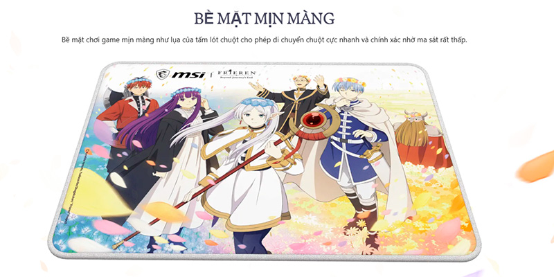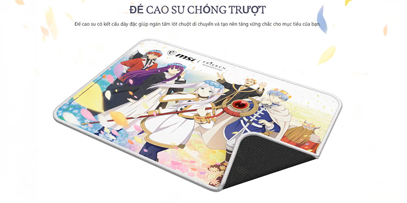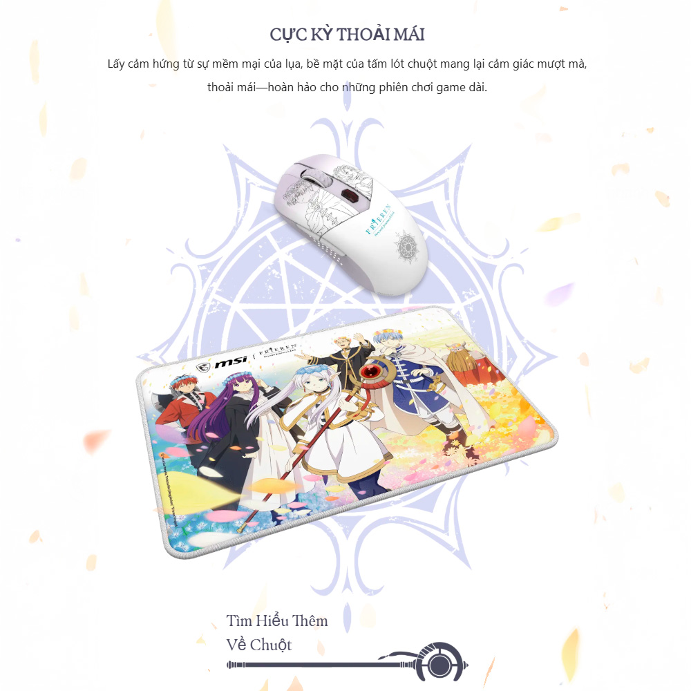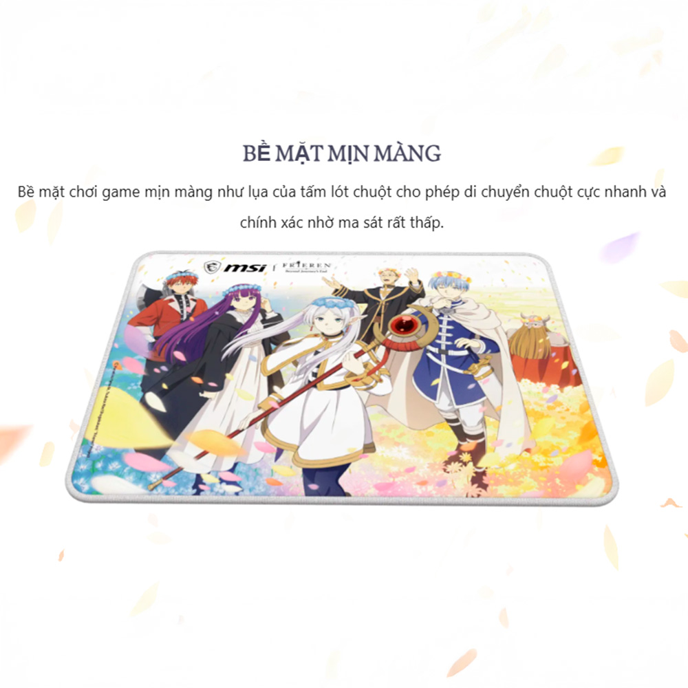lót chuột MSI AGILITY GD20 FRIEREN EDITION là sản phẩm nằm trong bộ sưu tập giới hạn hợp tác cùng series anime đình đám Frieren: Beyond Journey's End, đây không chỉ là một phụ kiện trang trí tuyệt đẹp mà còn mang đến không gian thao tác hoàn hảo. Sở hữu kích thước siêu rộng (Extensive size) lên đến 900 x 400 mm, chiếc lót chuột đóng vai trò như một chiếc Deskmat khổng lồ trải dài trên bàn làm việc của bạn. Diện tích này cho phép bạn đặt trọn vẹn cả bàn phím, chuột và nhiều phụ kiện khác lên trên, mang lại sự tự do tuyệt đối cho những pha vẩy chuột tốc độ cao mà không lo bị trượt ra khỏi mép.