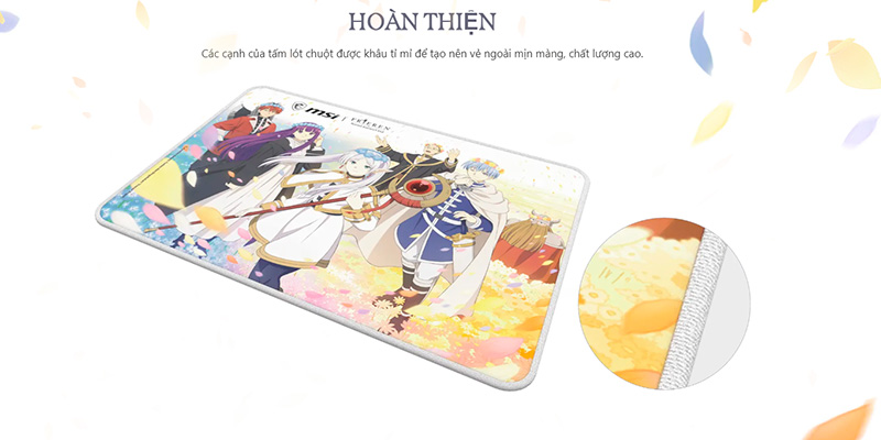 Đối với những chiếc lót chuột thông thường, hiện tượng bong tróc mép vải hay quăn mép (curling up) sau một thời gian sử dụng là điều rất dễ xảy ra. Tuy nhiên, MSI đã giải quyết triệt để vấn đề này trên phiên bản Frieren bằng kỹ thuật gia công mép viền vô cùng tinh xảo (Stitched edges). Các đường chỉ khâu được gia cố chắc chắn bao quanh toàn bộ chu vi của chiếc lót chuột, giúp liên kết chặt chẽ lớp vải bề mặt với đế cao su, kéo dài đáng kể tuổi thọ sản phẩm mà hoàn toàn không gây cấn tay khi sử dụng.