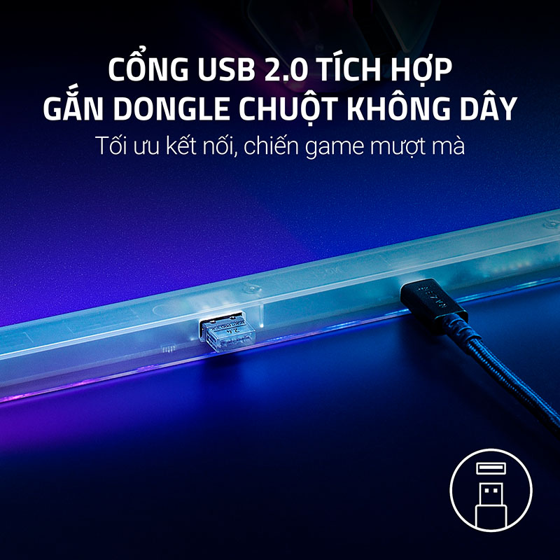 Một điểm tiện lợi nổi bật là cổng USB 2.0 tích hợp ngay trên thân lót chuột, cho phép bạn kết nối đầu thu không dây của chuột ở khoảng cách gần nhất với thiết bị, từ đó giảm độ trễ và nhiễu sóng. Ngoài ra, bạn cũng có thể sử dụng cổng này để kết nối các thiết bị ngoại vi như bàn phím, tai nghe USB hoặc USB lưu trữ tiện lợi.