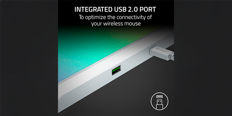 Một điểm tiện lợi nổi bật là cổng USB 2.0 tích hợp ngay trên thân lót chuột, cho phép bạn kết nối đầu thu không dây của chuột ở khoảng cách gần nhất với thiết bị, từ đó giảm độ trễ và nhiễu sóng. Ngoài ra, bạn cũng có thể sử dụng cổng này để kết nối các thiết bị ngoại vi như bàn phím, tai nghe USB hoặc USB lưu trữ tiện lợi.