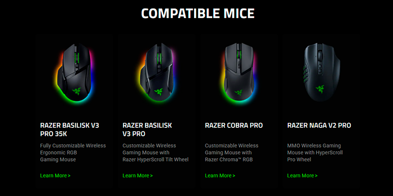 Razer HyperFlux V2 Wireless Charging hỗ trợ nhiều mẫu chuột không dây cao cấp như Razer Basilisk V3 Pro 35K, Razer Basilisk V3 Pro, Razer Naga V2 Pro và Razer Cobra Pro, những mẫu chuột sở hữu hiệu suất gaming hàng đầu. Với sự tương thích mở rộng, bạn có thể linh hoạt nâng cấp chuột trong tương lai mà không cần đổi lót. Đây là trạm sạc trung tâm lý tưởng cho hệ sinh thái Razer HyperSpeed, vừa tiết kiệm không gian, vừa tăng tính đồng bộ trong setup gaming hoặc làm việc.