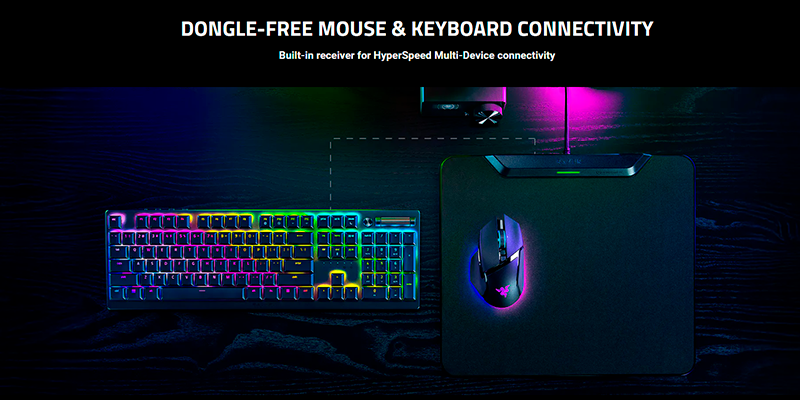 Razer HyperFlux V2 tích hợp kết nối thông minh không cần dongle, cho phép ghép nối chuột Razer tương thích chỉ bằng cách đặt lên pad – không cần cắm thêm USB receiver. Ngoài ra, sản phẩm còn hỗ trợ HyperSpeed Multi-Device, cho phép kết nối đồng thời chuột và bàn phím Razer không dây chỉ với một thiết bị duy nhất. Giải pháp này giúp tối giản không gian làm việc và chơi game, giảm số lượng cổng USB sử dụng và tăng tính linh hoạt trong việc quản lý thiết bị.