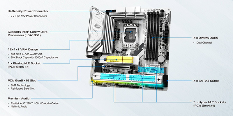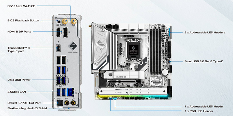 Mainboard ASRock B860M Steel Legend WiFi DDR5 hỗ trợ PCIe Gen5 x16 cho card đồ họa thế hệ mới, cùng Blazing M.2 Gen5 x4 mang lại băng thông lưu trữ lên đến 128Gb/s. Ngoài ra, bo mạch còn trang bị 3 khe M.2 Gen4 NVMe và 4 cổng SATA 6Gb/s, hỗ trợ RAID 0/1/5/10, đáp ứng mọi nhu cầu lưu trữ tốc độ cao. Đặc biệt, cổng Thunderbolt 4 Type-C 40Gb/s cho khả năng truyền dữ liệu cực nhanh, hỗ trợ xuất hình ảnh 8K 60Hz / 5K 120Hz, đồng thời tương thích USB4 và Power Delivery 15W.