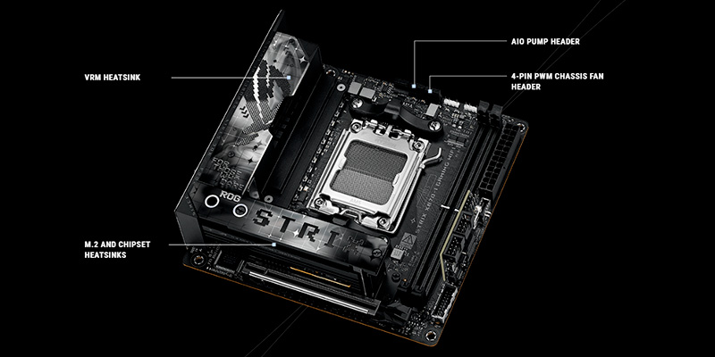 Dù nhỏ gọn, ASUS ROG STRIX X870-I GAMING WIFI DDR5 vẫn được đầu tư mạnh về khả năng tản nhiệt. Hệ thống heatsink nhôm phủ lớn cho VRM và khe M.2, kết hợp 1 đầu cắm CPU fan, 1 AIO pump và 1 chassis fan cho phép người dùng kiểm soát nhiệt độ linh hoạt trong không gian hạn chế. Thiết kế aluminum backplate chắc chắn, tích hợp Q-Design (Q-Latch, Q-DIMM, Q-Slot, Q-Antenna) giúp dễ tháo lắp, bảo trì dễ dàng. I/O shield được gắn sẵn, kết hợp nút BIOS FlashBack™ và Clear CMOS ngay trên bo mạch chủ, tạo điều kiện thuận lợi cho người dùng DIY và kỹ thuật viên chuyên nghiệp.