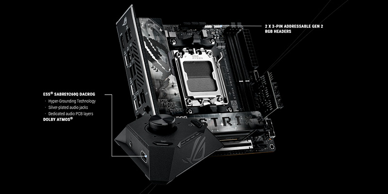 Mainboard trang bị kết nối không dây WiFi 7 chuẩn 802.11be, hỗ trợ băng tần 2.4/5/6GHz và băng thông 320MHz cho tốc độ lên đến 6.5Gbps, lý tưởng để chơi game không dây, stream và làm việc từ xa. Cổng mạng Intel 2.5Gb Ethernet đảm bảo tốc độ kết nối có dây luôn ổn định và mạnh mẽ. Ngoài ra, đi kèm là ROG STRIX HIVE II – module gắn ngoài độc quyền với ESS® SABRE9260Q DAC, điều chỉnh âm lượng, Q-LED báo lỗi, cổng USB và nút Power/FlexKey, giúp tăng trải nghiệm sử dụng và tối ưu vị trí kết nối cho case mini-ITX vốn có giới hạn cổng I/O. Đây là giải pháp âm thanh và điều khiển vượt trội, giúp bạn kiểm soát toàn bộ hệ thống ngay trong tầm tay.