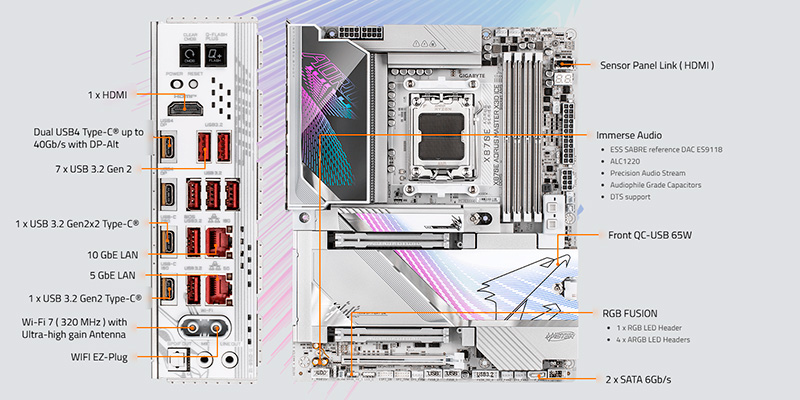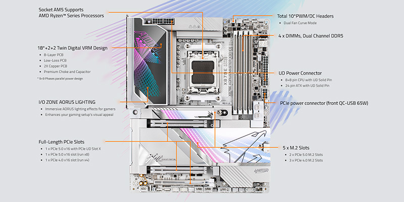 Hệ thống mở rộng trên X870E AORUS MASTER X3D ICE được thiết kế để đón đầu tương lai với khe cắm PCIe 5.0 x16 dành cho card đồ họa và khe M.2 PCIe 5.0 x4 cho ổ cứng SSD tốc độ cao. Bo mạch chủ cung cấp tổng cộng 4 khe cắm M.2, bao gồm 2 khe hỗ trợ chuẩn PCIe 5.0 và 2 khe PCIe 4.0, cho phép thiết lập các hệ thống lưu trữ RAID cực nhanh và an toàn. Về kết nối ngoại vi, sự hiện diện của 2 cổng USB4® USB Type-C® ở mặt sau mang lại băng thông 40Gbps, hỗ trợ xuất hình ảnh độ phân giải cao và truyền dữ liệu siêu tốc. Ngoài ra, cổng USB Type-C mặt trước hỗ trợ sạc nhanh 65W PD 3.0/QC 4+, tiện lợi cho việc sạc các thiết bị di động.