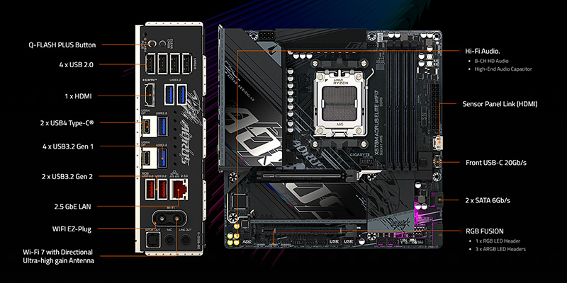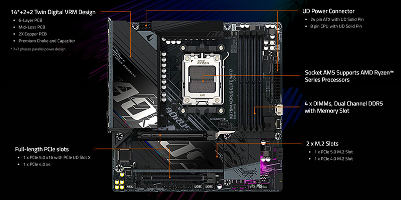 Mainboard Gigabyte X870M AORUS ELITE WIFI DDR5 được thiết kế để trở thành bệ phóng hoàn hảo cho các bộ vi xử lý AMD Ryzen™ 9000 Series, cũng như tương thích ngược hoàn toàn với Ryzen 8000 và 7000 Series trên nền tảng Socket AM5. Với chipset AMD X870 mạnh mẽ, bo mạch chủ này cung cấp băng thông hệ thống khổng lồ, hỗ trợ khe cắm mở rộng PCIe 5.0 x16 giúp khai thác tối đa sức mạnh của các card đồ họa thế hệ mới nhất. Đây là giải pháp lý tưởng cho những người dùng đam mê công nghệ muốn xây dựng một dàn PC hiệu suất cao nhưng vẫn giữ được sự nhỏ gọn nhờ kích thước Micro ATX (24.4cm x 24.4cm), phù hợp với nhiều không gian lắp đặt khác nhau mà không phải hy sinh khả năng mở rộng.