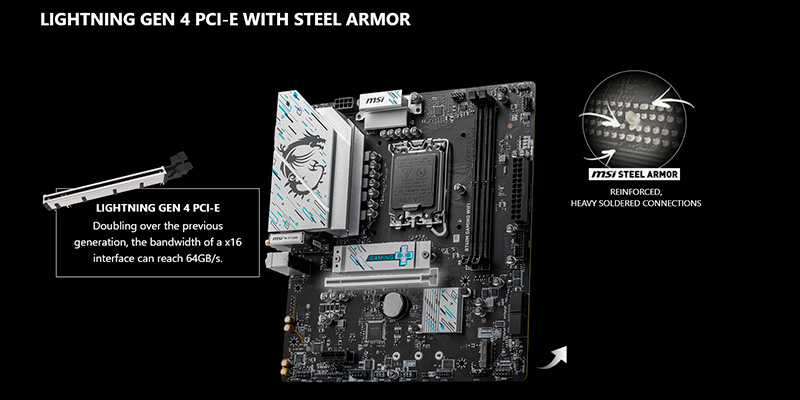 Về lưu trữ, Mainboard MSI B760M GAMING WIFI DDR5 hỗ trợ tới 2 khe M.2 trong đó M.2_1 lấy tín hiệu trực tiếp từ CPU, hỗ trợ PCIe 4.0 x4 tốc độ cao, còn M.2_2 hỗ trợ cả PCIe 4.0 x4 và SATA cho tính linh hoạt khi nâng cấp. Ngoài ra còn có 4 cổng SATA 6Gb/s, hỗ trợ RAID 0, 1, 5, 10 giúp bạn xây dựng hệ thống lưu trữ an toàn và hiệu quả. Điều này rất phù hợp với các nhu cầu sử dụng ổ SSD NVMe tốc độ cao kết hợp với ổ HDD dung lượng lớn. Cơ chế tự động vô hiệu hóa cổng SATA khi dùng SSD M.2 SATA cũng giúp tối ưu hóa hiệu năng và tránh xung đột phần cứng.
