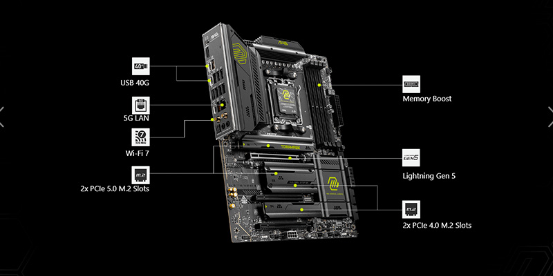 Để đáp ứng nhu cầu lưu trữ tốc độ cao, MSI đã trang bị cho sản phẩm khe cắm mở rộng PCIe 5.0 x16 (PCI_E1) kết nối trực tiếp với CPU, sẵn sàng cho các card đồ họa thế hệ tiếp theo với băng thông khổng lồ. Hệ thống lưu trữ bao gồm tổng cộng 4 khe cắm M.2, trong đó có hai khe M.2 Gen 5 x4 siêu tốc (M.2_1 và M.2_2) giúp tận dụng tối đa tốc độ của các ổ cứng NVMe hiện đại nhất. Người dùng cũng có thể thiết lập các cấu hình RAID 0, 1, 5 và 10 cho ổ cứng NVMe để bảo vệ dữ liệu hoặc tăng tốc độ truy xuất. Cần lưu ý rằng khe M.2_2 và các cổng USB 40Gbps phía sau chia sẻ băng thông, mang lại sự linh hoạt tùy chỉnh theo nhu cầu sử dụng thực tế của người dùng.