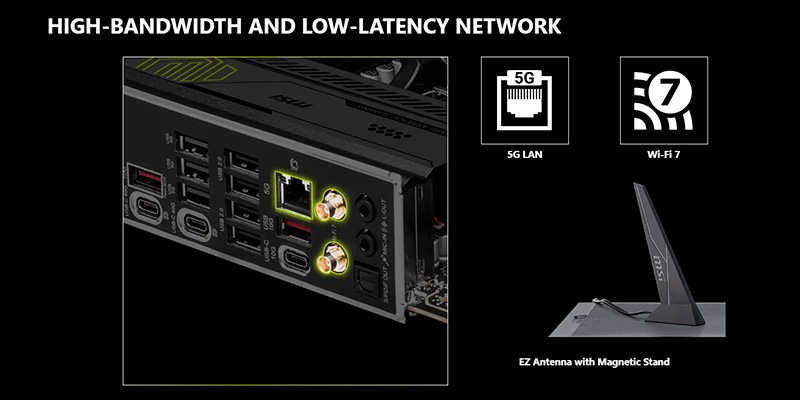 Khả năng kết nối mạng và ngoại vi của bo mạch chủ này thực sự vượt trội với sự hiện diện của Wi-Fi 7 tiên tiến, hỗ trợ băng tần 6GHz và độ rộng kênh 320MHz cho tốc độ lên đến 5.8Gbps. Kết hợp với đó là cổng mạng Realtek® 8126 5G LAN, cung cấp đường truyền internet có dây ổn định và nhanh gấp 5 lần chuẩn Gigabit truyền thống, cực kỳ hữu ích cho việc tải game nặng hay stream nội dung 4K. Về kết nối ngoại vi, sự xuất hiện của 2 cổng USB4® 40Gbps Type-C ở mặt sau mở ra khả năng truyền tải dữ liệu thần tốc và xuất hình ảnh chất lượng cao. Ngoài ra, công nghệ Bluetooth® 5.4 mới nhất cũng được tích hợp, giúp kết nối các thiết bị không dây như tai nghe, tay cầm chơi game một cách mượt mà và tiết kiệm năng lượng hơn.