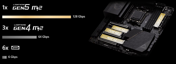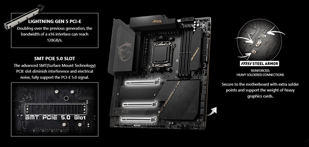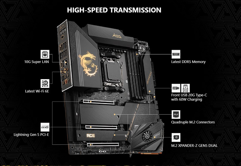 Lighting PCIe Gen 5 M2 Mainboard PC MSI MEG X670E ACE với giao diện PCIe x16 5.0 cho băng thông lên đến 128Gbps và cung cấp hỗ trợ NVMe SSD RAID để tăng hiệu suất đáng kinh ngạc. Tạo cấu hình RAID với thiết bị lưu trữ PCIe để tận hưởng tốc độ truyền dữ liệu nhanh nhất. |