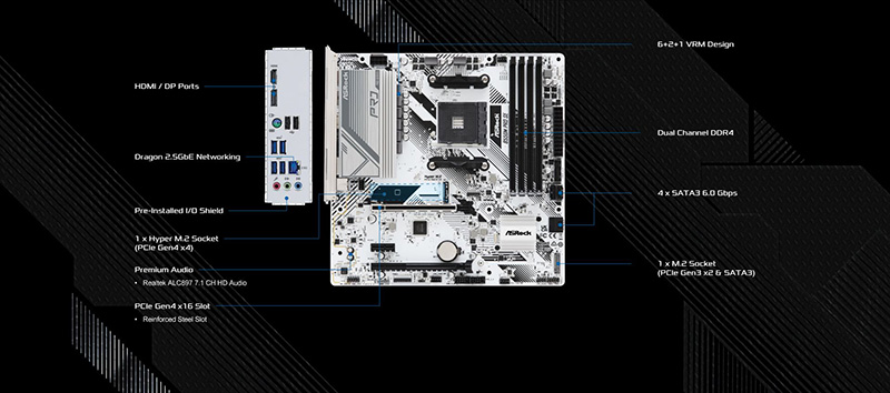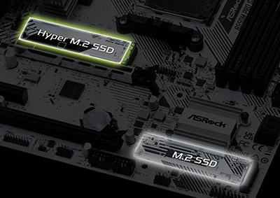 SSD M.2 kép Mainboard ASRock B550M Pro SE hỗ trợ khe cắm M.2 PCIe Gen4 x4 64Gbps và khe cắm M.2 SATA 6Gbps |