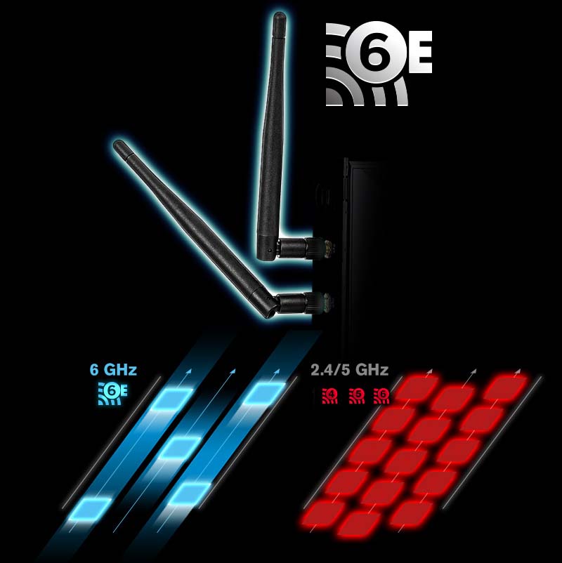 WiFi 6E ASRock B660M Pro RS/AX mở rộng băng tần 6GHz mới cung cấp nhiều khả năng WiFi hơn và cung cấp lưu lượng truy cập internet nhanh hơn và tốt hơn. Ngoài việc cung cấp tốc độ cao hơn, WiFi 6E cũng tăng cường độ trễ thấp hơn và hỗ trợ các mức dịch vụ tương đương với mạng 5G. |