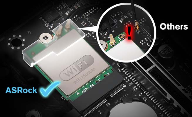 Nắp bảo vệ M.2 Key-E ASRock B660M Pro RS/AX trang bị nắp bảo vệ cáp SMA khỏi tình trạng bị lỏng để bảo vệ người dùng khỏi những tình huống không muốn có. |