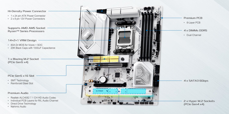 ASRock X870 STEEL LEGEND WIFI sở hữu thiết kế mạnh mẽ với các chi tiết kim loại và lớp phủ PCB màu đen mờ, mang đến vẻ đẹp cứng cáp và hiện đại cho bộ PC của bạn. Các linh kiện được lựa chọn kỹ càng và trải qua quy trình kiểm tra nghiêm ngặt, đảm bảo độ bền và tuổi thọ lâu dài.
