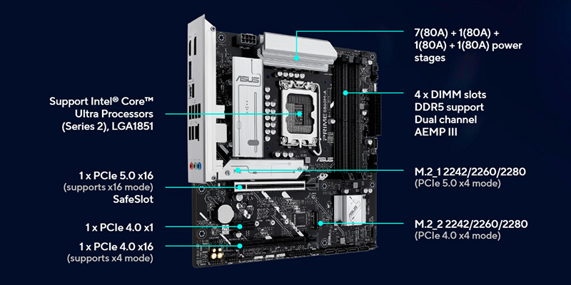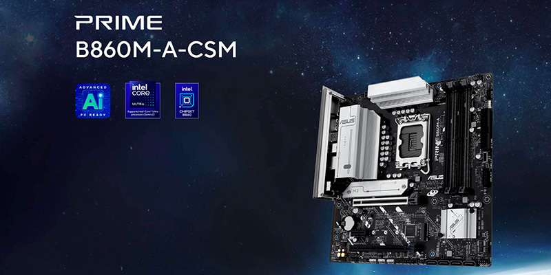 Mainboard PC ASUS PRIME B860M-A-CSM hỗ trợ bộ vi xử lý Intel Core Ultra thế hệ thứ 2 mới nhất thông qua socket LGA1851, đảm bảo hiệu suất xử lý mạnh mẽ và ổn định cho mọi tác vụ từ cơ bản đến nâng cao như công việc văn phòng, thiết kế đồ họa hay giải trí đa phương tiện. Hệ thống VRM tối ưu cấp điện năng ổn định và hiệu quả, giúp CPU phát huy tối đa sức mạnh, xử lý nhanh chóng các tác vụ yêu cầu hiệu năng cao.