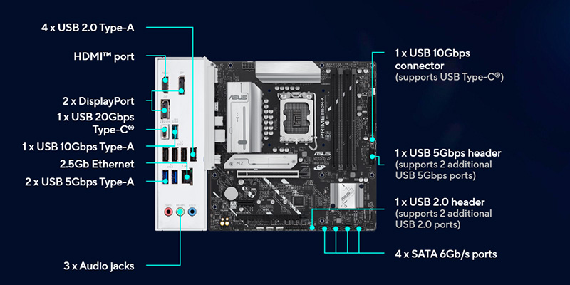 ASUS PRIME B860M-A-CSM trang bị đa dạng các cổng kết nối bao gồm USB Type-C tốc độ cao 20Gbps, USB 3.2 Gen 2, HDMI và DisplayPort, hỗ trợ hiệu quả các thiết bị ngoại vi và màn hình độ phân giải cao. Thiết kế bo mạch thông minh giúp việc lắp đặt, bảo trì và nâng cấp hệ thống trở nên đơn giản, tiện lợi hơn bao giờ hết, tiết kiệm tối đa thời gian và công sức của người dùng.