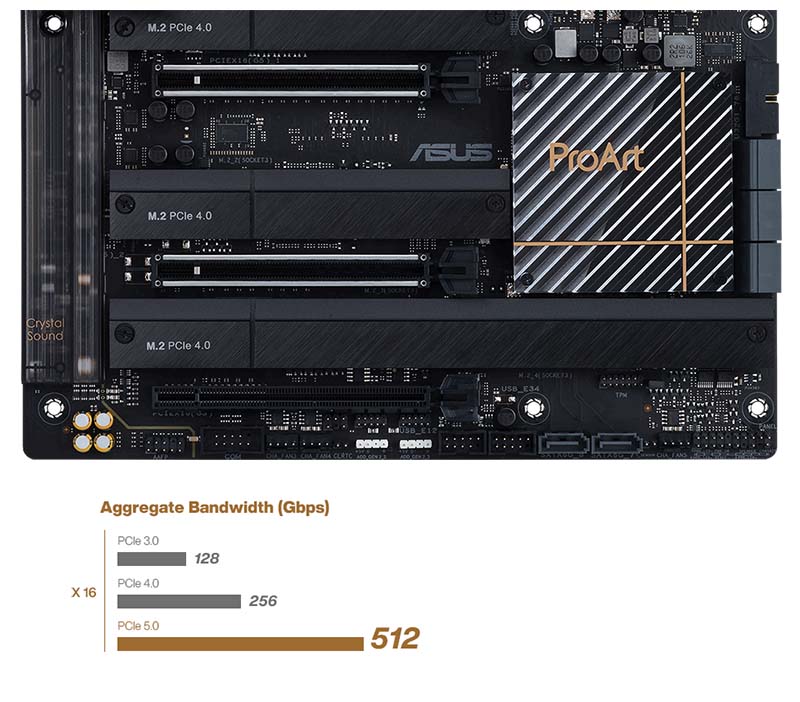 PCIe 5.0 ProArt Z690-CREATOR WIFI mang vi xử lý core intel 12 với khả năng hỗ trợ PCIe 5.0, cung cấp tốc độ gấp đôi so với PCIe 4.0 để thực hiện các tác vụ nặng về dữ liệu cũng như cải thiện tính toàn vẹn của tín hiệu và khả năng tương thích ngược với các phiên bản PCIe trước đó. |