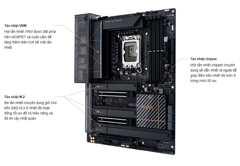 Khả năng tản nhiệt ProArt Z690-CREATOR WIFI trang bị bộ tản nhiệt khối lượng lớn với bề mặt rộng bao phủ các khu vực VRM và cuộn cảm giúp cải thiện khả năng tản nhiệt cùng tấm tản nhiệt chất lượng cao cho khe cắm M.2 để giữ cho SSD M.2 hoạt động ở nhiệt độ tối ưu, đảm bảo hiệu suất và độ tin cậy nhất quán |