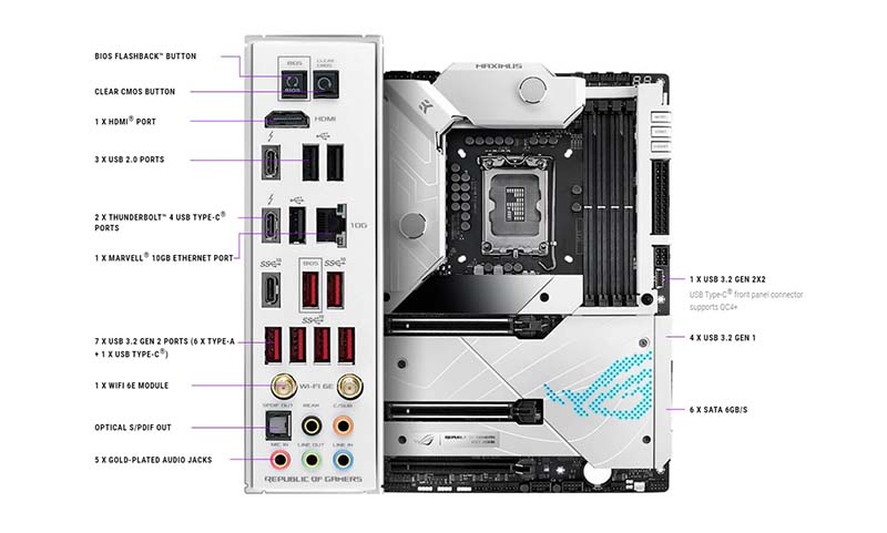 2 x ThunderBolt 4 7 x USB 3.2 Gen 2 (6 Type-A, 1 Type-C) 3 x USB 2.0 1 x HDMI 1 x Wi-Fi Module 1 x 10Gb Ethernet port 5 x Gold-plated audio jacks 1 x Optical S/PDIF out 1 x BIOS FlashBack™ button 1 x Clear CMOS button |
