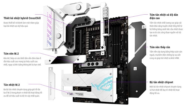 DRAM OverClocking ROG Maximus Z690 Formula hỗ trợ 4 Ram DDR5 ép xung đến 6400+, cung cấp khả năng truy cập băng thông bộ nhớ và bổ sung các vùng che chắn giúp giảm đáng kể nhiễu xuyên âm |