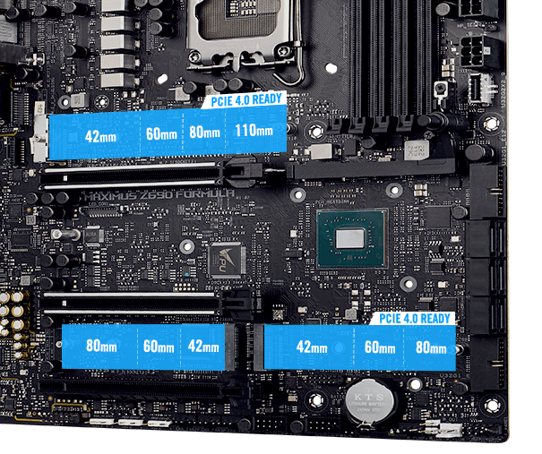 Hỗ trợ M.2 PCIe 4.0 ROG Maximus Z690 Formula hỗ trợ đến 3 khe cắm M.2 PCIe hỗ trợ tới 4.0 và cung cấp hỗ trợ NVMe SSD RAID để tăng hiệu suất đáng kinh ngạc. Tạo cấu hình RAID với thiết bị lưu trữ PCIe để tận hưởng tốc độ truyền dữ liệu nhanh nhất. |
