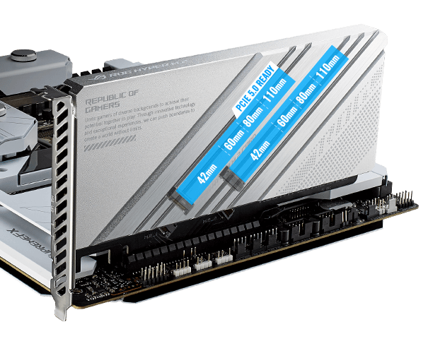 Hyper M.2 Card PCIe 5.0 ROG Maximus Z690 Formula đi kèm thêm hai khe cắm trong ROG Hyper M.2, một trong số đó là PCIe 5.0 và sẵn sàng hoạt động với tốc độ gấp đôi so với khe PCIe 4.0 |