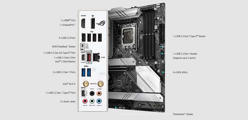 Cổng kết nối ROG STRIX B660-A GAMING WIFI được trang bị đẩy đủ các cổng kết nối để bạn dễ dàng lắp đặt.
