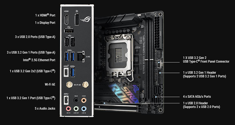 Cổng kết nối ROG STRIX B760-I GAMING WIFI được trang bị đẩy đủ các cổng kết nối để bạn dễ dàng lắp đặt.