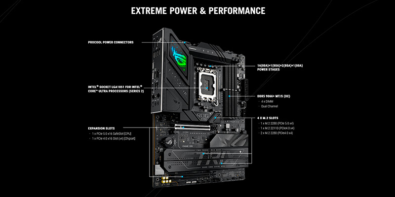 Bo mạch chủ hỗ trợ RAM DDR5 kênh đôi, với tốc độ lên đến 9066MHz và khả năng mở rộng dung lượng lên đến 192GB, giúp tăng tốc độ phản hồi hệ thống, cải thiện khả năng xử lý tác vụ nặng như render video, thiết kế đồ họa và chơi game AAA.