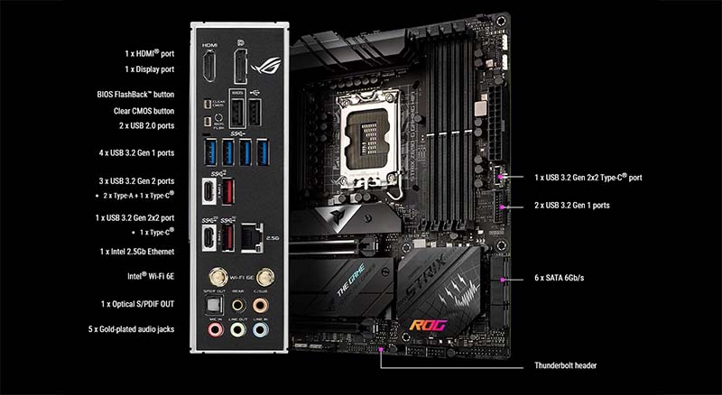 Cổng kết nối ROG STRIX Z690-G GAMING WIFI được trang bị đẩy đủ các cổng kết nối để bạn dễ dàng lắp đặt.