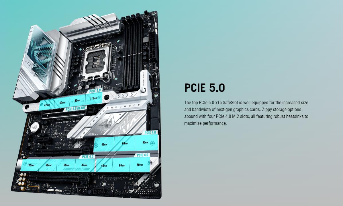 ROG STRIX Z790-A GAMING WIFI trang bị PCIe 5.0 x 16 SafeSlot và hỗ trợ đến 4 khe cắm M.2 PCIe 4.0 cùng NVMe SSD RAID để tăng hiệu suất đáng kinh ngạc. Tạo cấu hình RAID với thiết bị lưu trữ PCIe để tận hưởng tốc độ truyền dữ liệu nhanh nhất.