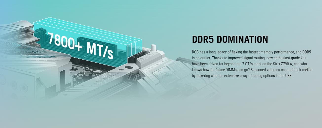 ROG STRIX Z790-A GAMING WIFI hỗ trợ Ram DDR5 ép xung đến 7800+, cung cấp khả năng truy cập băng thông bộ nhớ và bổ sung các vùng che chắn giúp giảm đáng kể nhiễu xuyên âm.